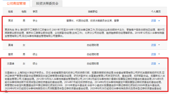 沈雪峰身兼华泰柏瑞基金总经理助理,而总经理贾波,有着工商银行、华泰证券等机构任职背景,2016年加入公司后主导管理。
